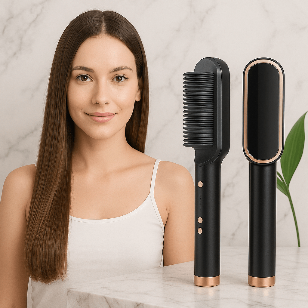 Alisa tu cabello de forma rápida y segura con un diseño práctico que combina cepillo y plancha en un solo dispositivo.